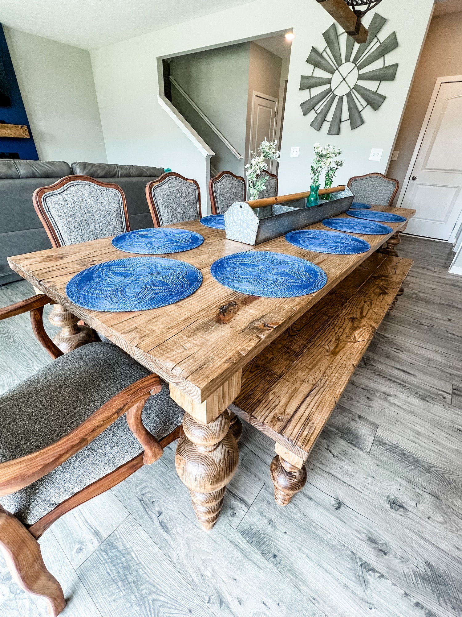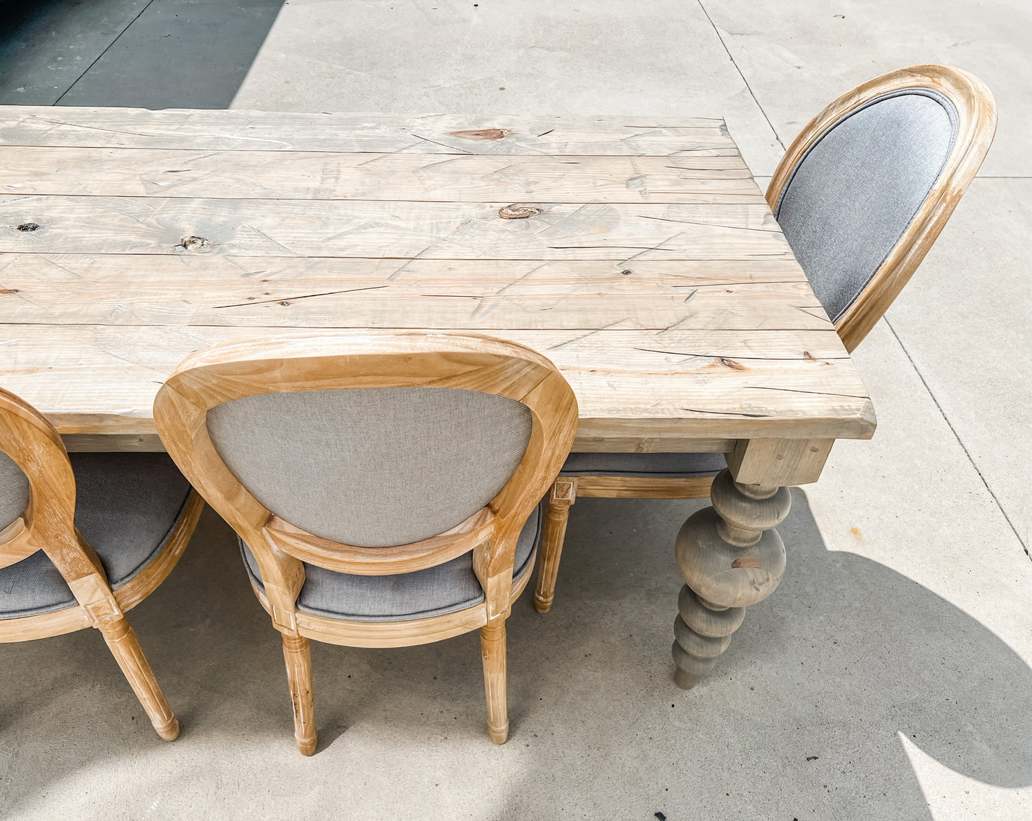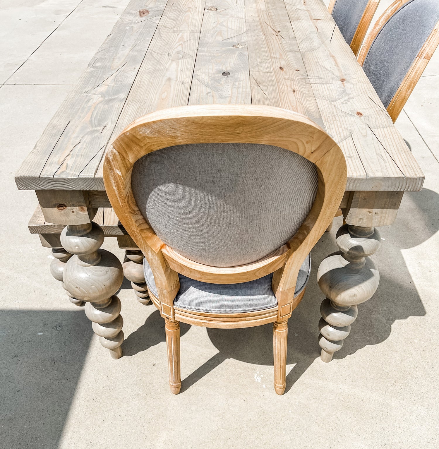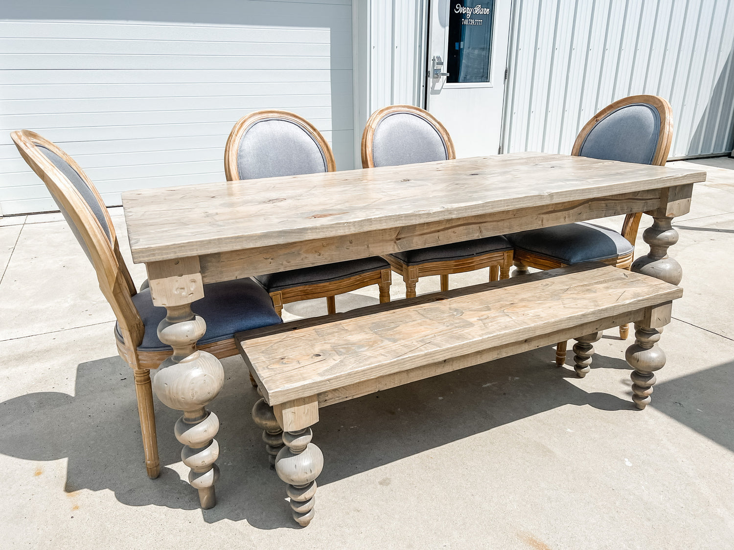 This is our beautiful modern chunky leg table. This elegant table is the perfect addition to any space and is sure to catch the attention of everyone who sees it! This French-inspired dining table exhibits substantial wood-turned legs and a beautifully handcrafted wood top.